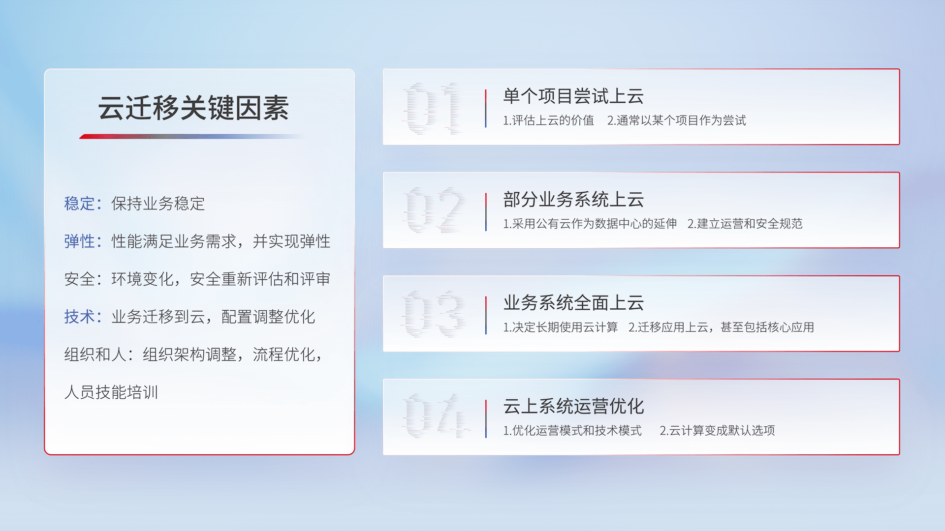 结合实际业务,,,从规划设计、、云平台选型、、、云原生改造、、、、数据迁移、、、集成交付,,迁移全过程为客户识别最佳上云路径,,做好风险识别管理,,,,设计网络架构、、身份权限、、、安全审计合规、、、、操作审计、、、、日志审计、、监控告警策略、、多站点容灾设计等,,,对云上基础设施进行整体规划,,提升IT治理水平,,,,以满足弹性、、高可用、、高性能的需求。。。