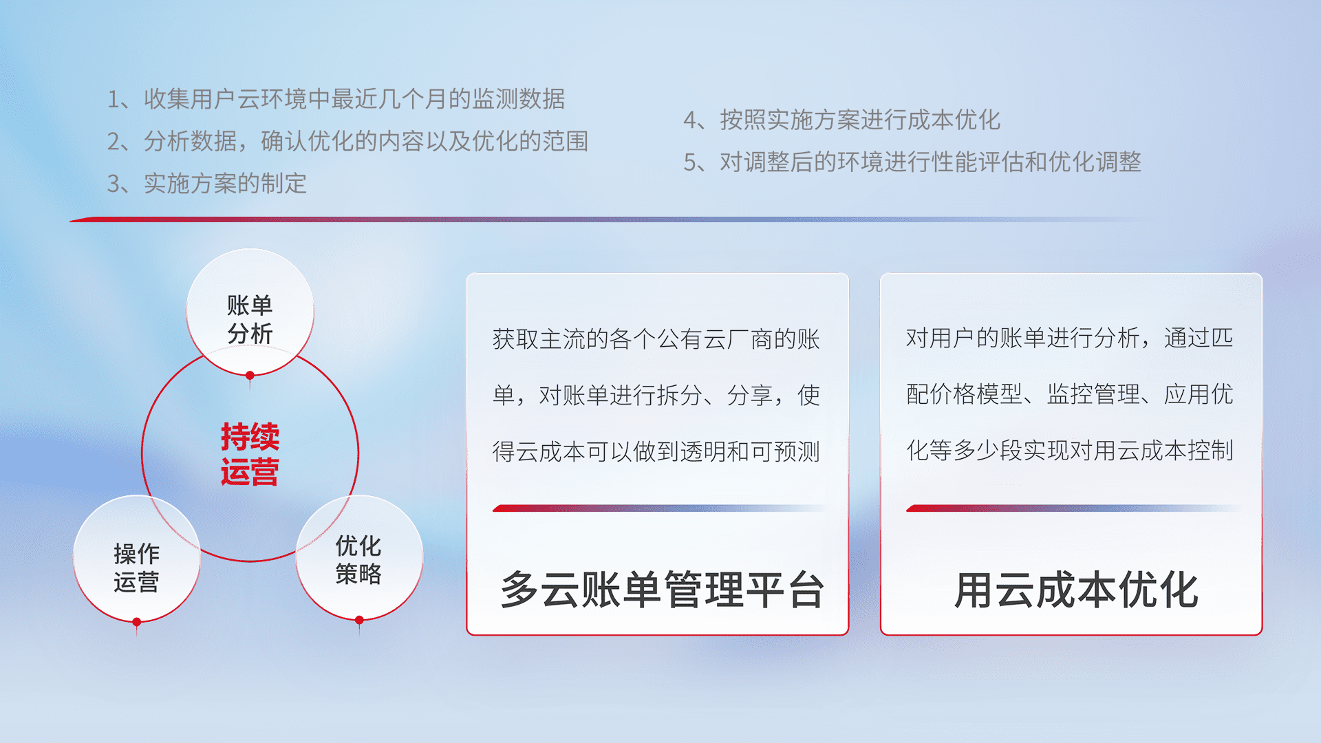 通过多云纳管,,,,以统一的资源数据模型把客户的云资源进行抽象和封装,,进而实现对多云资源的统一操作,,,,保障云资源管理的可靠性、、、、稳定性与可用性。。。量身定制化运维内容,,配置、、、、开发运维、、、、补丁管理、、、、备份、、监控、、、、认证和访问管理、、、审计和日常巡检等,,,保障在用云过程中的可靠度,,稳定度以及高可用率。。